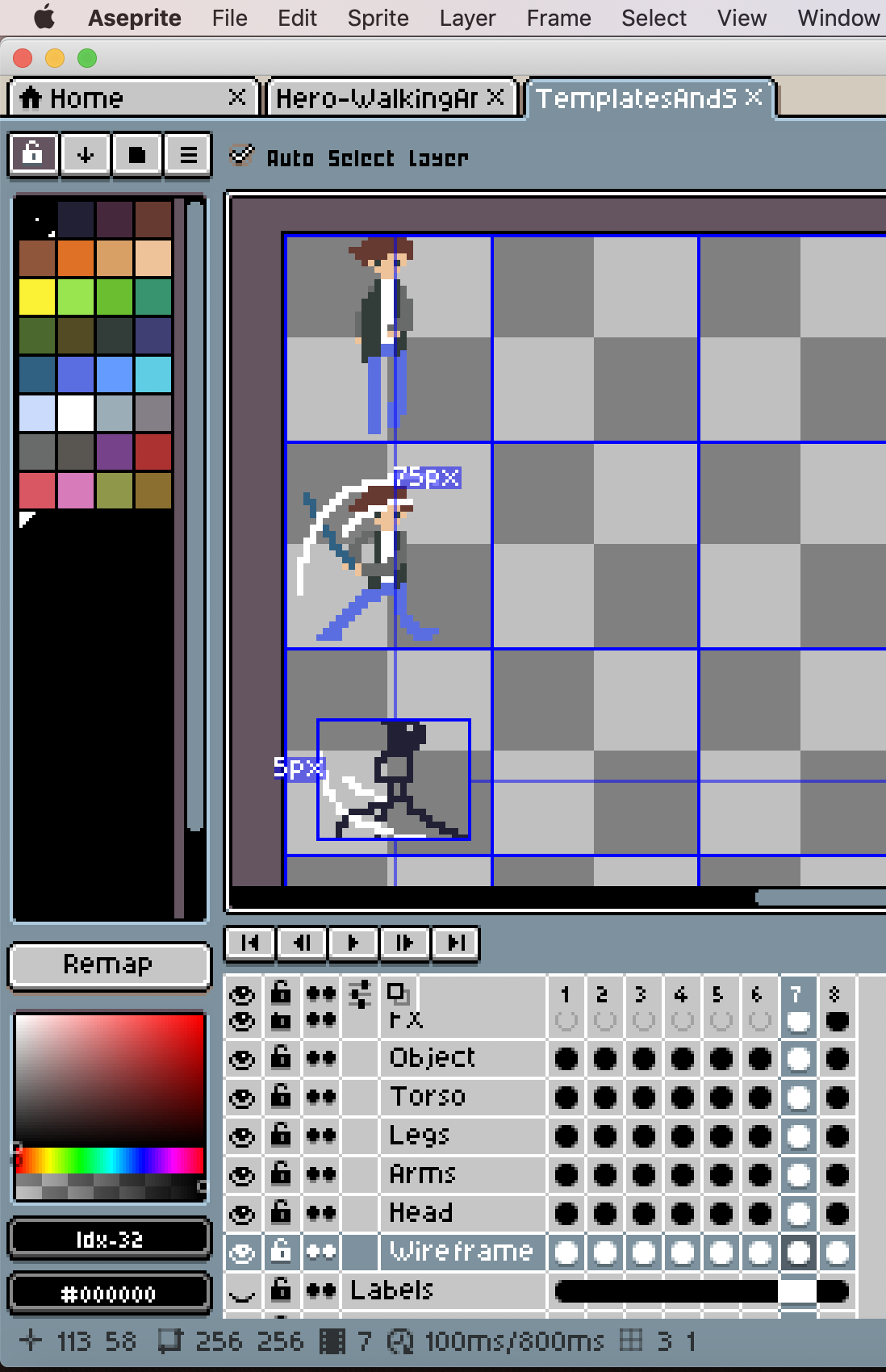 Using Aseprite, I built “wireframes” and “skeletons” of my animations before adding a “texture” layer on top. Here’s what the two look like: