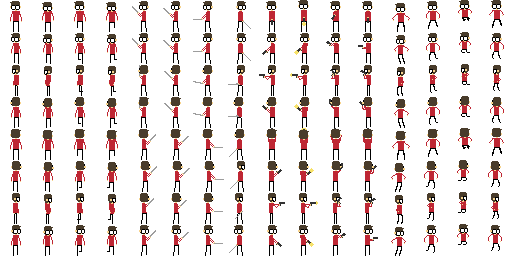 For the first entry, I decide to create a few pixelart sprites to use in Unity game prototypes. They are based on an organizational system that uses rows to distinguish angles and column groups of 2 to 4 to distinguish individual frames in an animation. This makes the code for sprite generation simpler to reason about using meaningful indices.