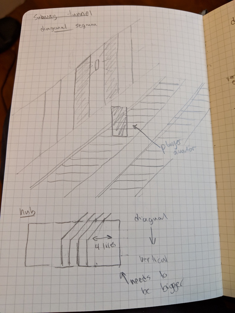 My focus this week was to conceive of some zombie enemies for my in-progress game as well as think of organizational systems for levels and maps, starting with a subway tunnel concept.